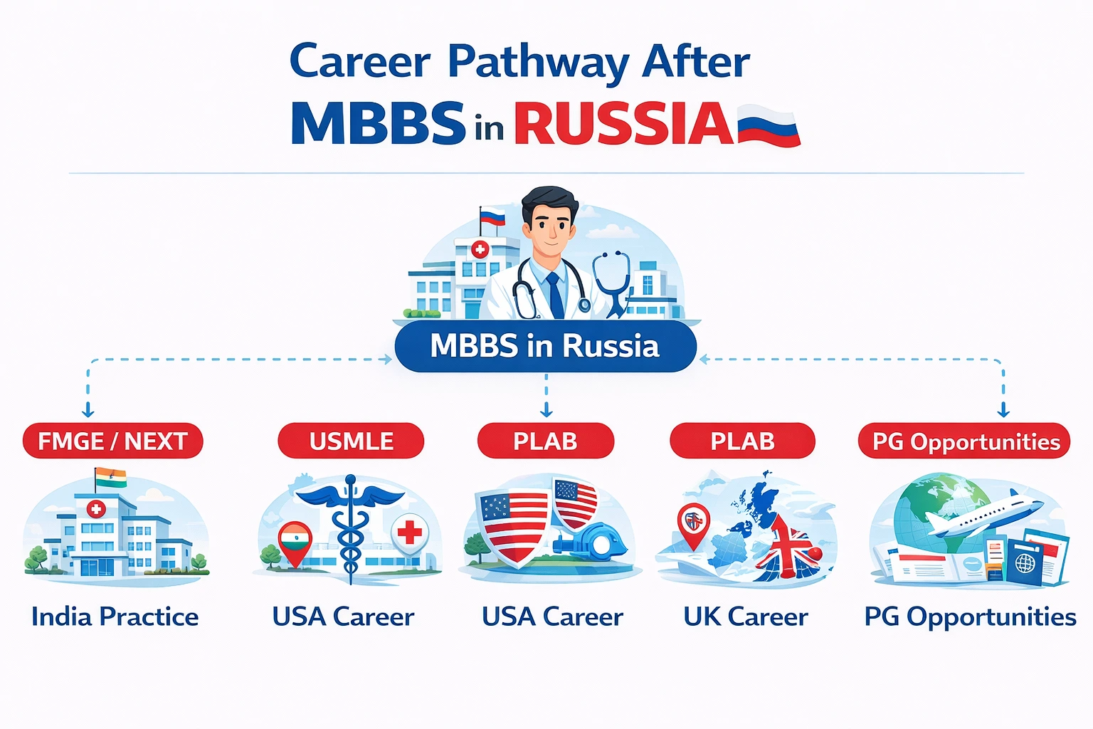 | Career Options | India (FMGE/NEXT), USA (USMLE), UK (PLAB), PG Abroad |